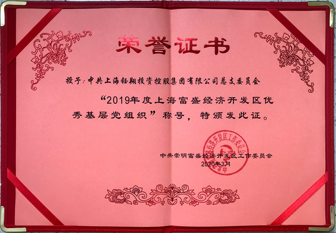 近日,集團黨總支被評為2019年度崇明富盛經濟開發(fā)區(qū)優(yōu)秀基層黨組織。