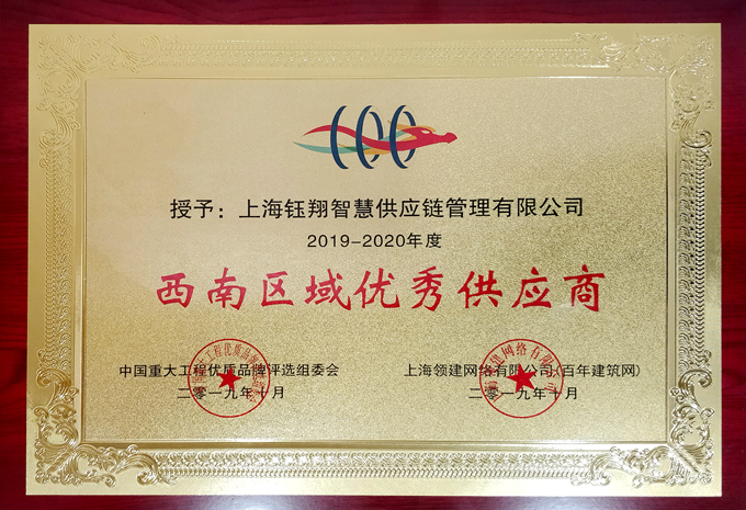 近日,上海鈺翔智慧供應鏈管理有限公司被百年建筑網評為“西南區域優秀供應商”稱號。